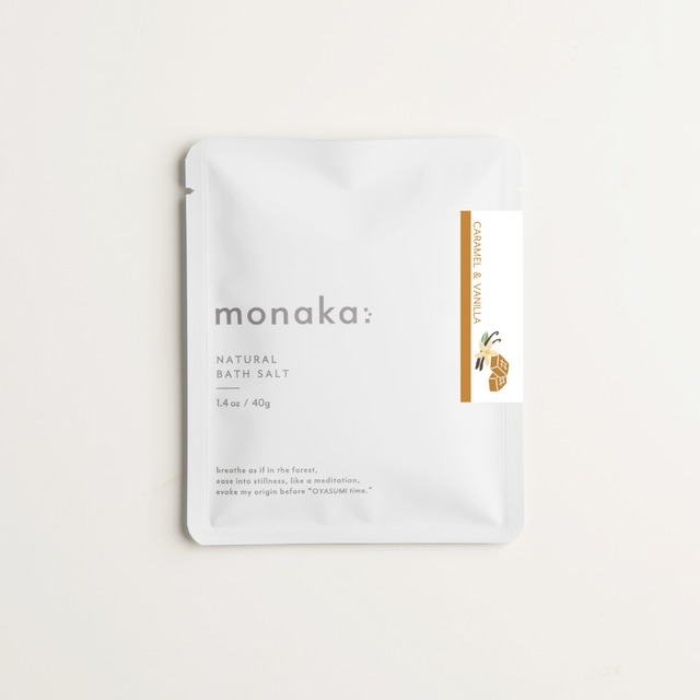 キャラメル × バニラエクストラクト -香ばしいキャラメルとバニラの甘さが、湯船に溶ける穏やかな香り- 頑張った一日の終わりに。 濃厚なミルクと、リッチなバニラの深い甘さを感じる至福のひととき。 【ミネラル豊富で環境にも優しい天然塩】 西オーストラリアの塩田で製造される「シャークベイソルト」を使用。 太陽と風の力で2~3年かけて結晶化させる「天日塩製法」で作られた塩は、環境にも優しいだけでなく、 カルシウム・マグネシウムなどのミネラル成分が豊富に含まれる。 【ヒアルロン酸Na配合】 1gで約6Lもの保水力を誇る、保湿美容成分を配合。 使用方法: 140~160Lのお湯に対して、40gを目安にご使用ください。 -monaka ナチュラルバスソルト- 素材を味わう、優しい入浴時間。 日々の暮らしの中で、心落ち着く「ほっとできる時間」をお届け。 天然素材と香りで、森の中を歩くような心地よい時間を。