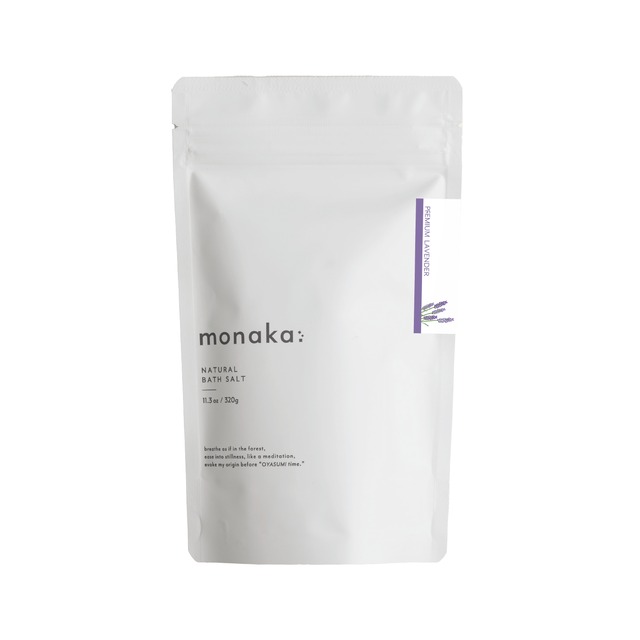 ラベンダー精油 × ラベンダー花 -優しく心地よい香りが、夜に溶け込む- おやすみ前のラベンダー習慣♪ 芳醇なラベンダーの香りが、あなたを深く優しく包みこむ。 【ミネラル豊富で環境にも優しい天然塩】 西オーストラリアの塩田で製造される「シャークベイソルト」を使用。 太陽と風の力で2~3年かけて結晶化させる「天日塩製法」で作られた塩は、環境にも優しいだけでなく、 カルシウム・マグネシウムなどのミネラル成分が豊富に含まれる。 【ヒアルロン酸Na配合】 1gで約6Lもの保水力を誇る、保湿美容成分を配合。 使用方法: 140~160Lのお湯に対して、1包(40g)を目安にご使用ください。 ラベンダー花が入っていますので、付属のメッシュ袋に入れてお楽しみください。 -monaka ナチュラルバスソルト- 素材を味わう、優しい入浴時間。 日々の暮らしの中で、心落ち着く「ほっとできる時間」をお届け。 天然素材と香りで、森の中を歩くような心地よい時間を。