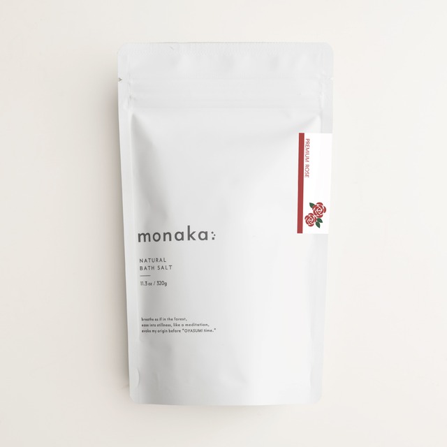 ローズ精油 × ローズ花 -優雅さと気品を併せ持つ、贅沢ローズの余韻- 華やかさと香水のような高級感を併せ持つ、女性に大人気の香り。 今晩はお姫様気分で♪ 【ミネラル豊富で環境にも優しい天然塩】 西オーストラリアの塩田で製造される「シャークベイソルト」を使用。 太陽と風の力で2~3年かけて結晶化させる「天日塩製法」で作られた塩は、環境にも優しいだけでなく、 カルシウム・マグネシウムなどのミネラル成分が豊富に含まれる。 【ヒアルロン酸Na配合】 1gで約6Lもの保水力を誇る、保湿美容成分を配合。 使用方法: 140~160Lのお湯に対して、1包(40g)を目安にご使用ください。 ローズ花が入っていますので、付属のメッシュ袋に入れてお楽しみください。 -monaka ナチュラルバスソルト- 素材を味わう、優しい入浴時間。 日々の暮らしの中で、心落ち着く「ほっとできる時間」をお届け。 天然素材と香りで、森の中を歩くような心地よい時間を。